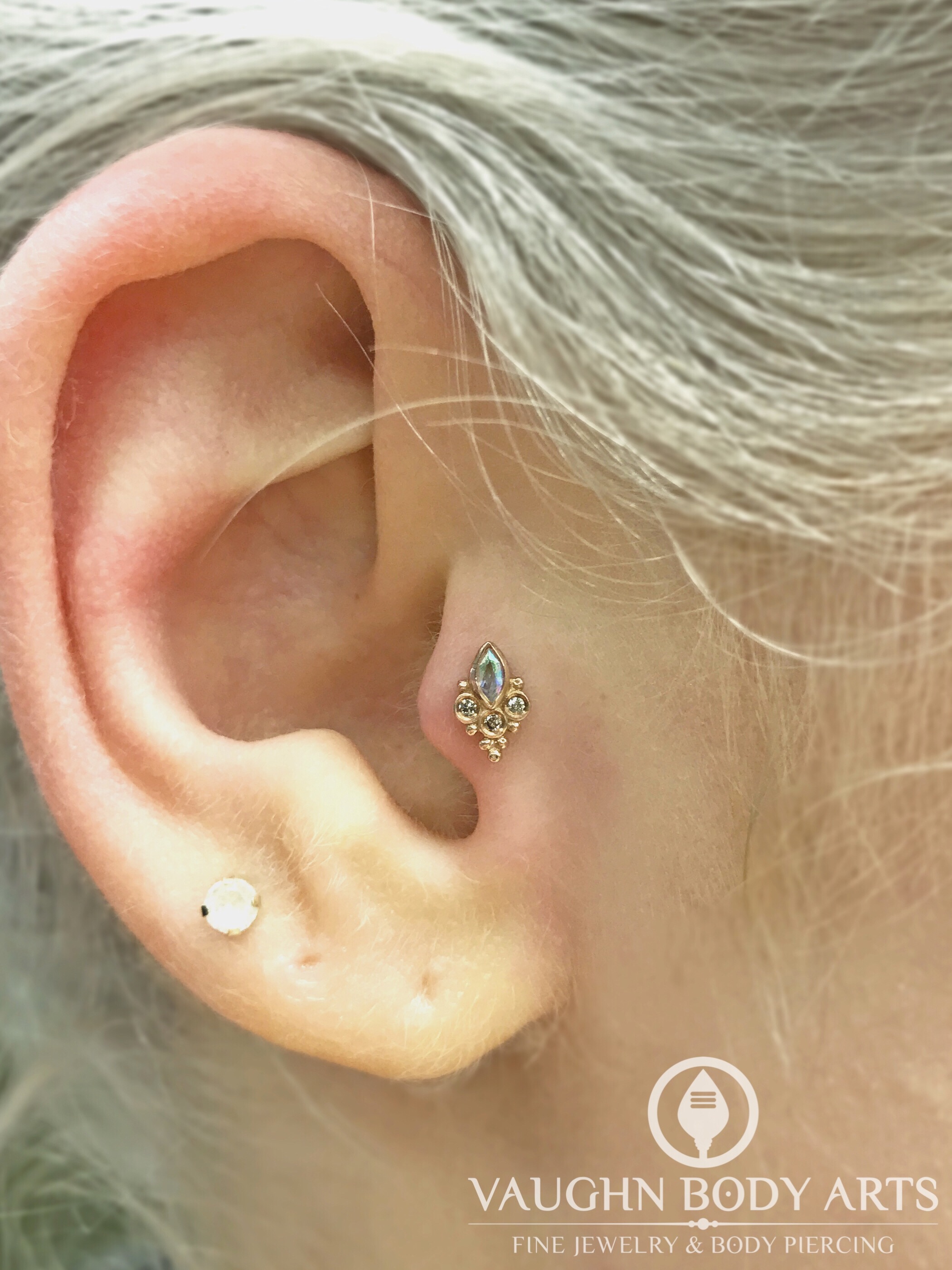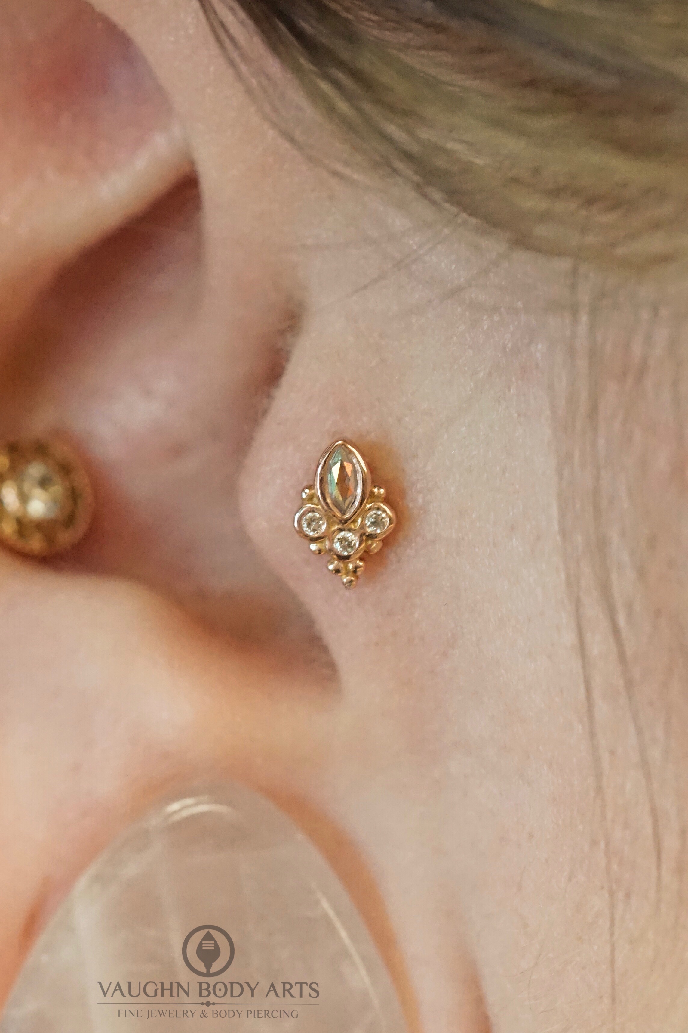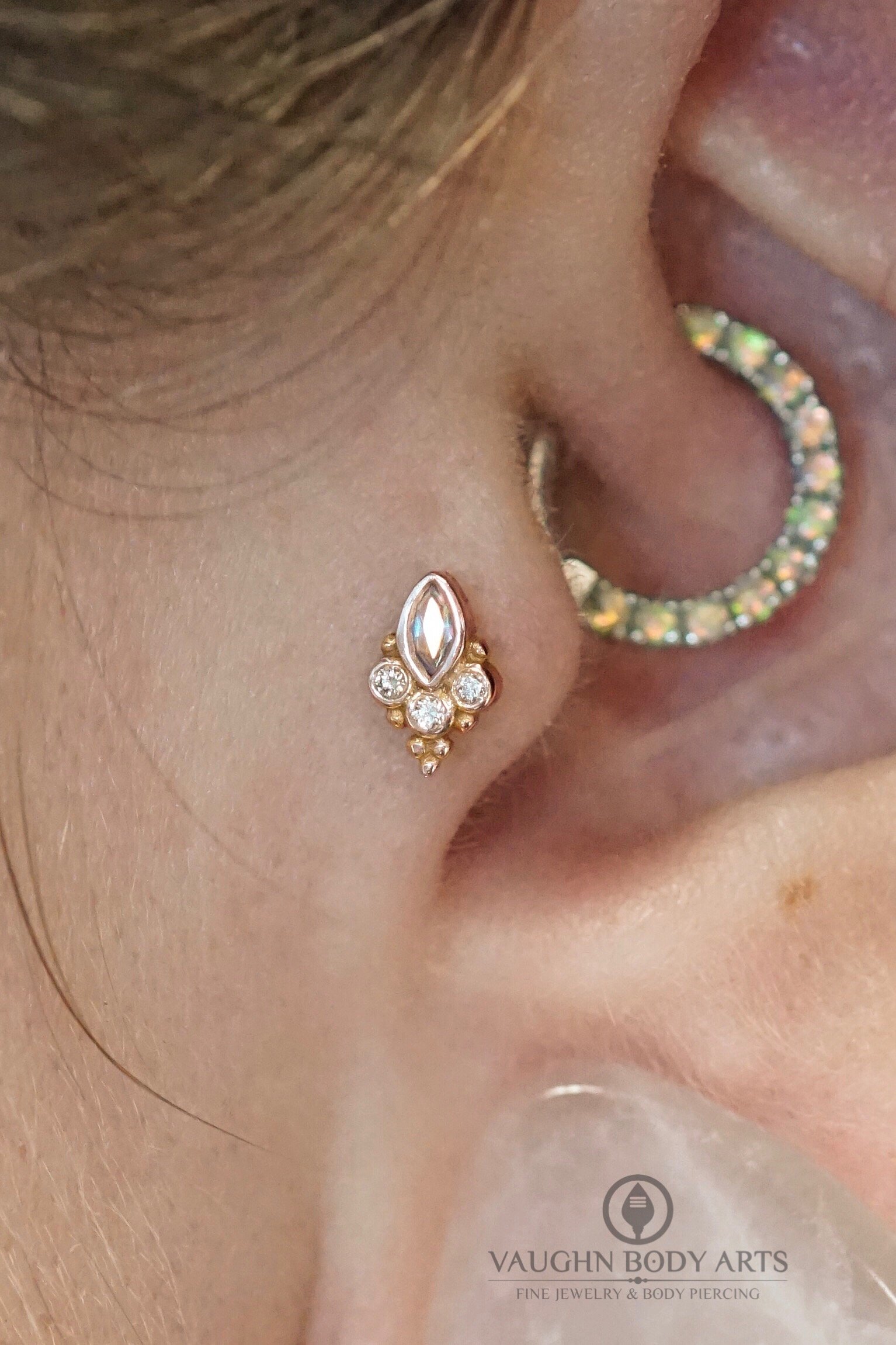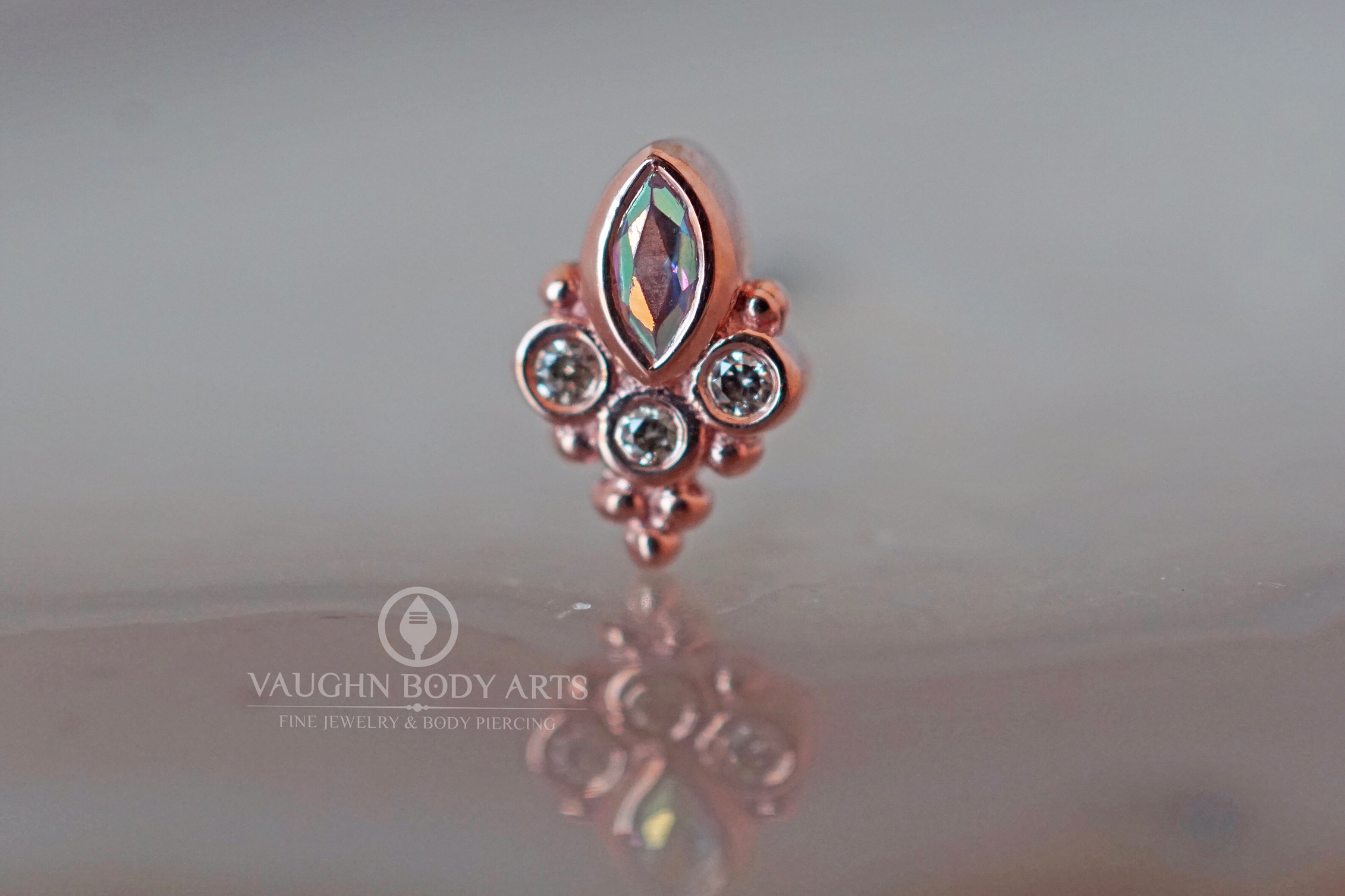 Solid 14 karat Rose Gold "Marquise Sarai" threaded end, featuring a 3mm x 1.5mm Mercury Mist Topaz and 1mm genuine Champagne Diamond accents by BVLA.