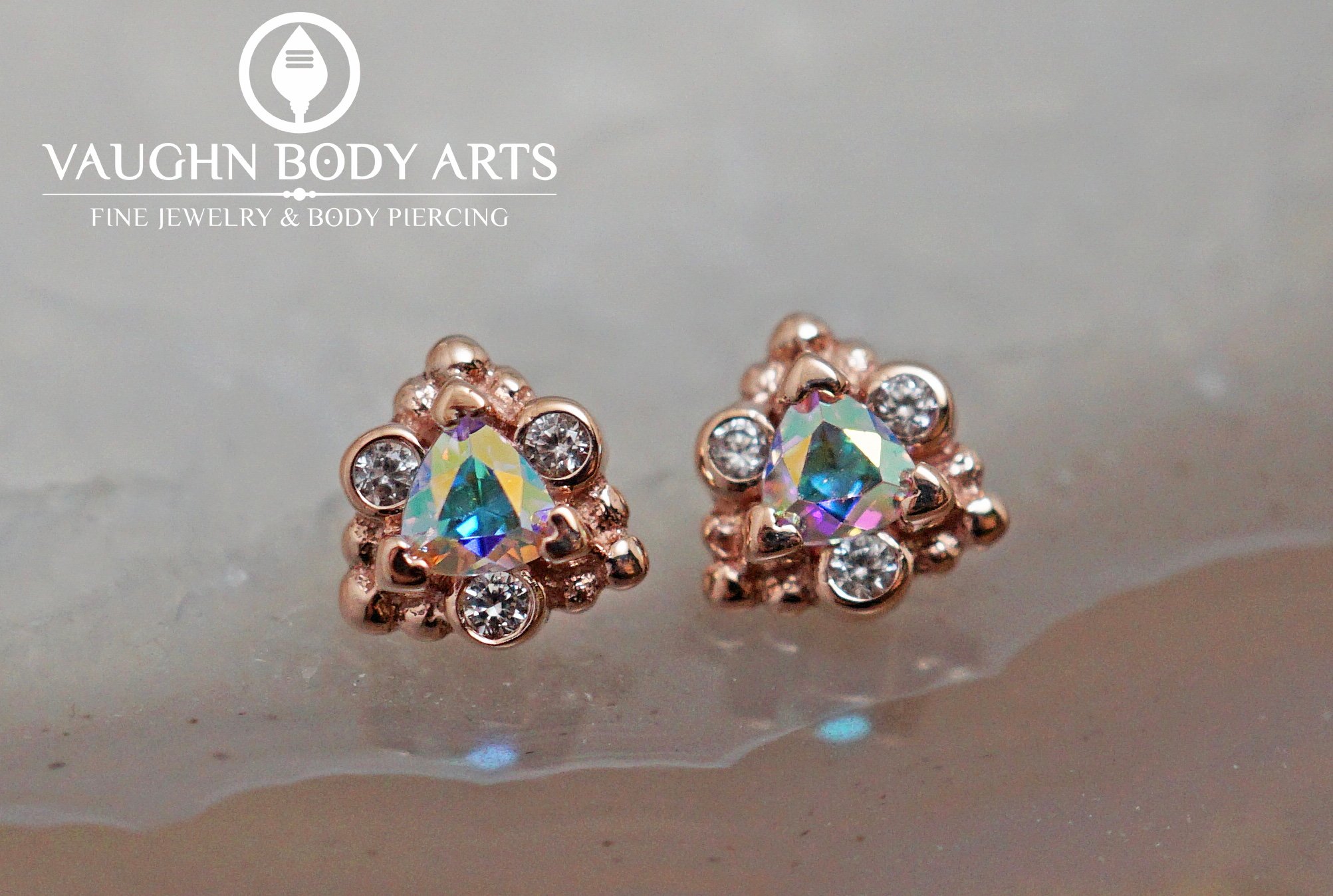 A beautifully ornate piece featuring a 3mm Trillion-Cut Mercury Mist Topaz and three 1.25mm CZ.