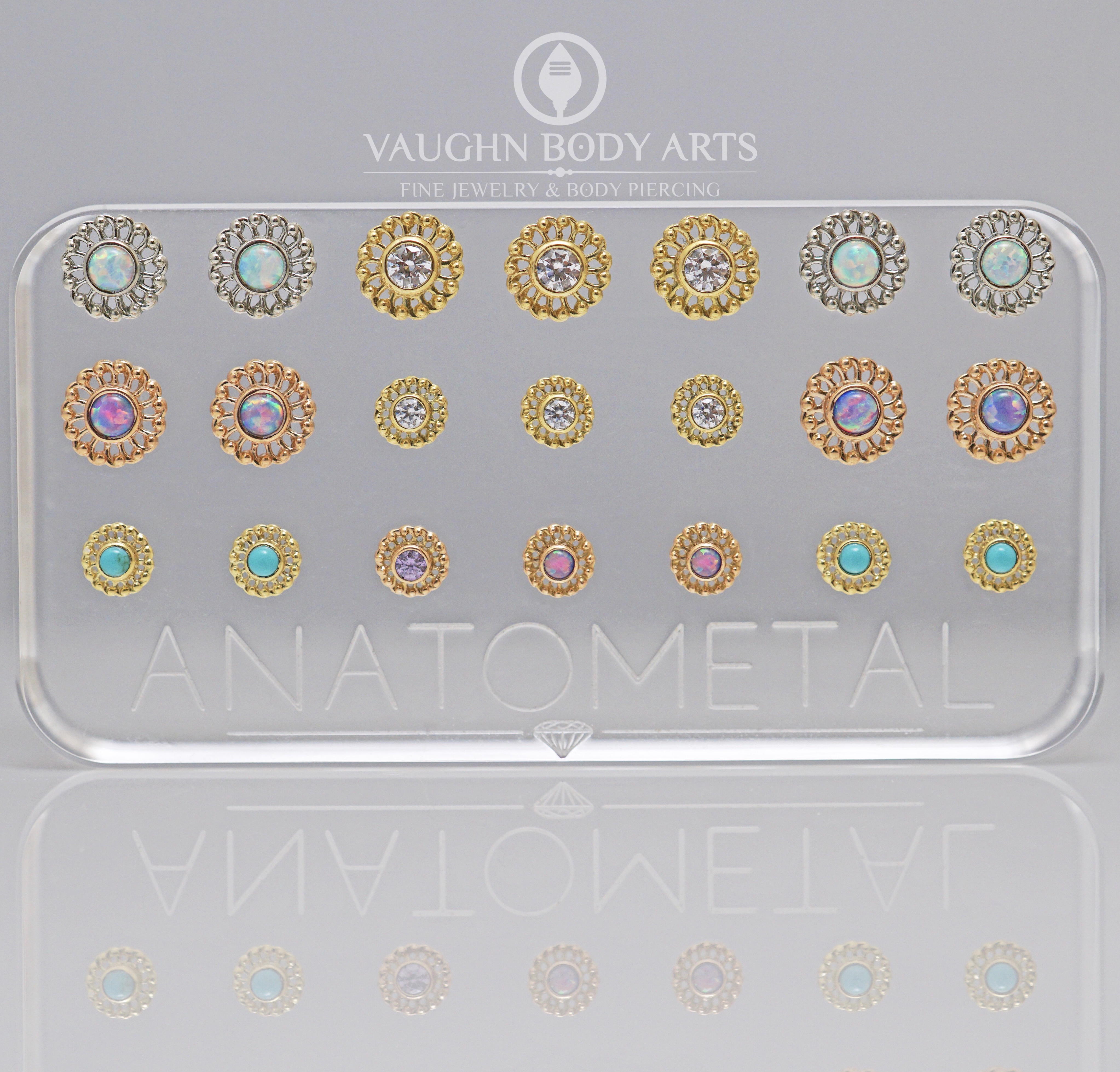 *Note: These can be custom ordered with any gemstone combination. Available in white gold, yellow gold, and rose gold. Contact Vaughn Body Arts for custom designing.