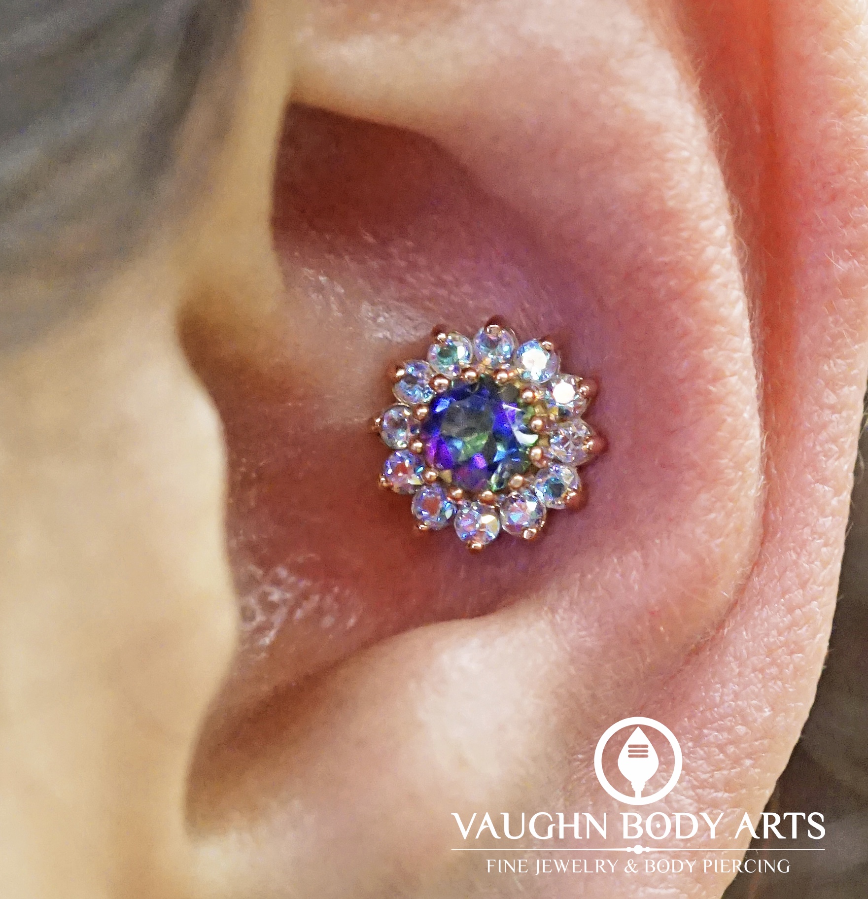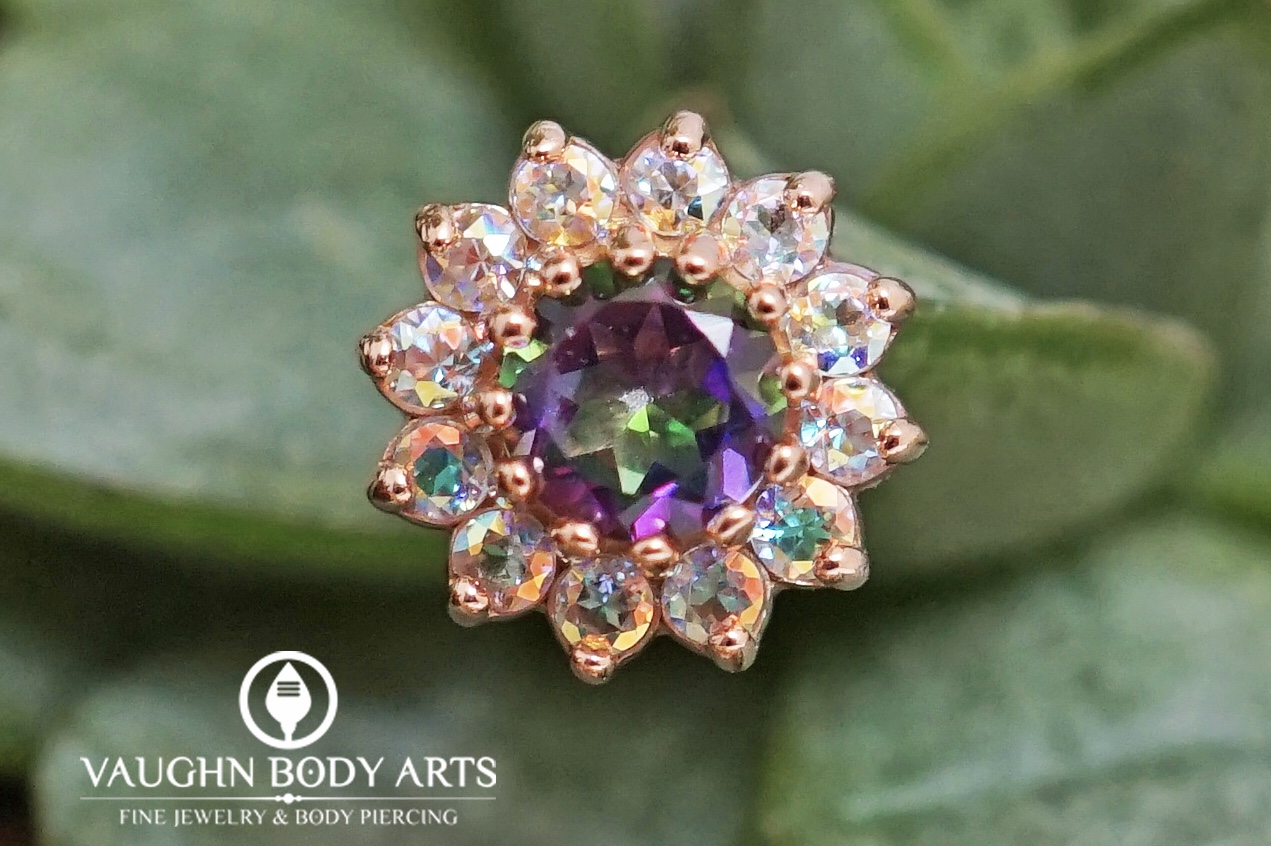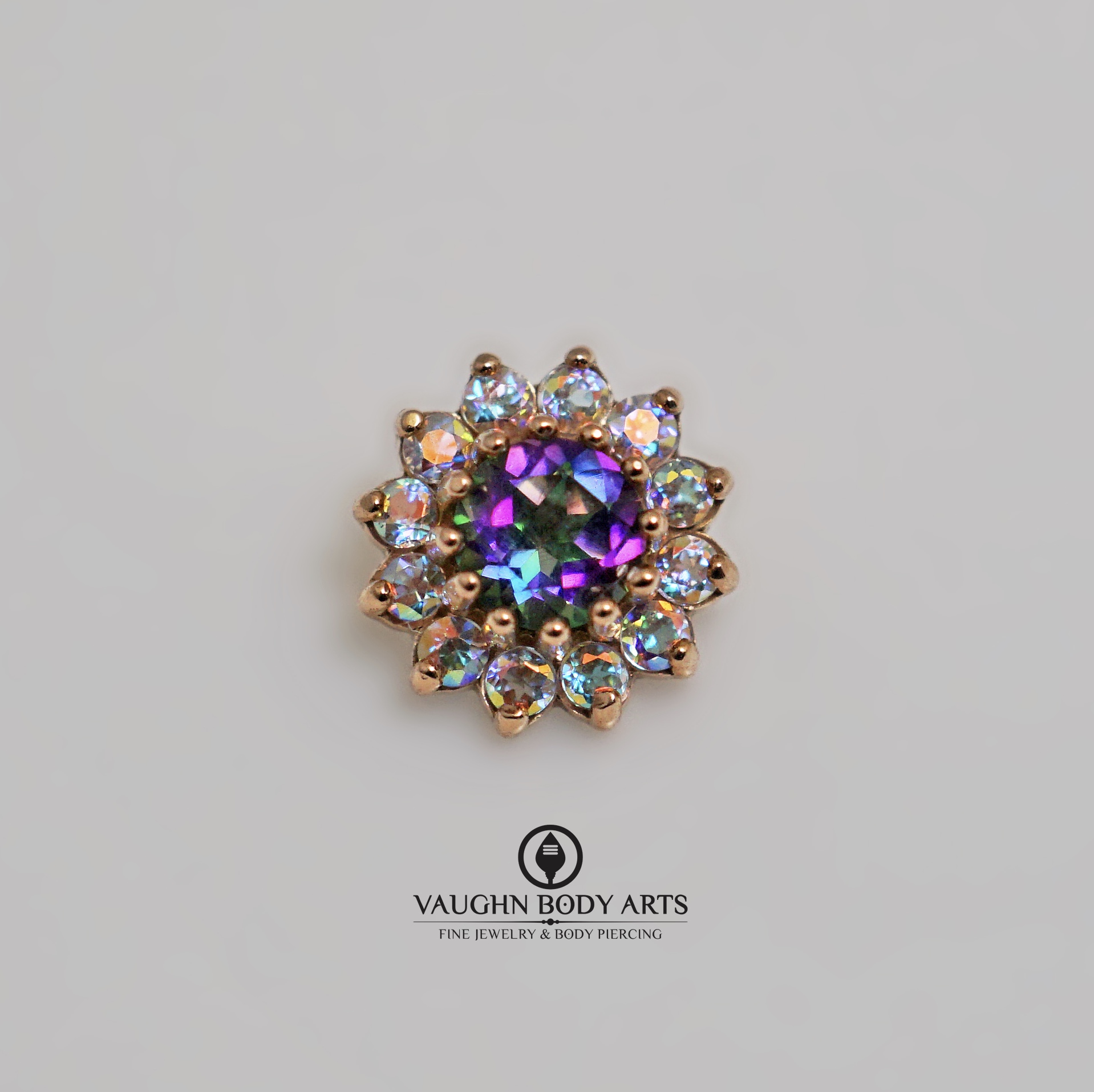 BVLA solid 14 karat Rose Gold "Rose" threaded end, featuring a 4mm Mystic Topaz and twelve 1.5mm Mercury Mist Topaz.